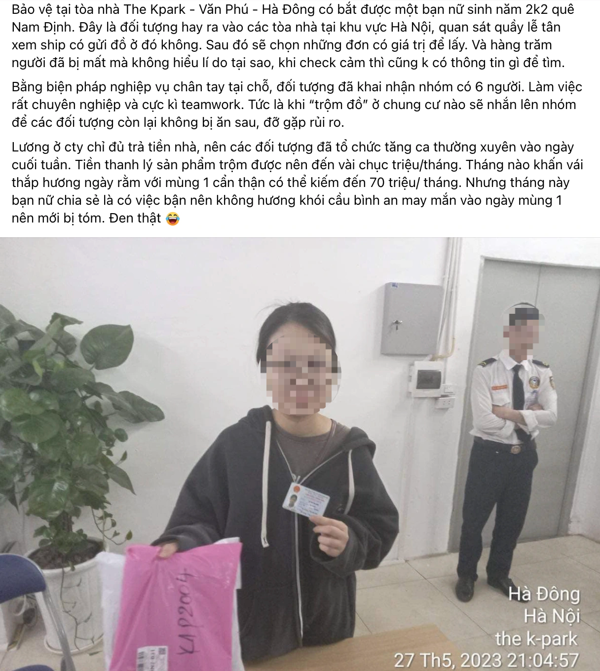 Ngày 29/5, lãnh đạo UBND phường Phú La (quận Hà Đông, Hà Nội) cho biết các cơ quan chức năng địa phương đang xác minh, điều tra vụ một cô gái bị tố chuyên lấy trộm đồ do các shipper (người giao hàng) gửi cho khách sống tại Khu đô thị The K Park Văn Phú.