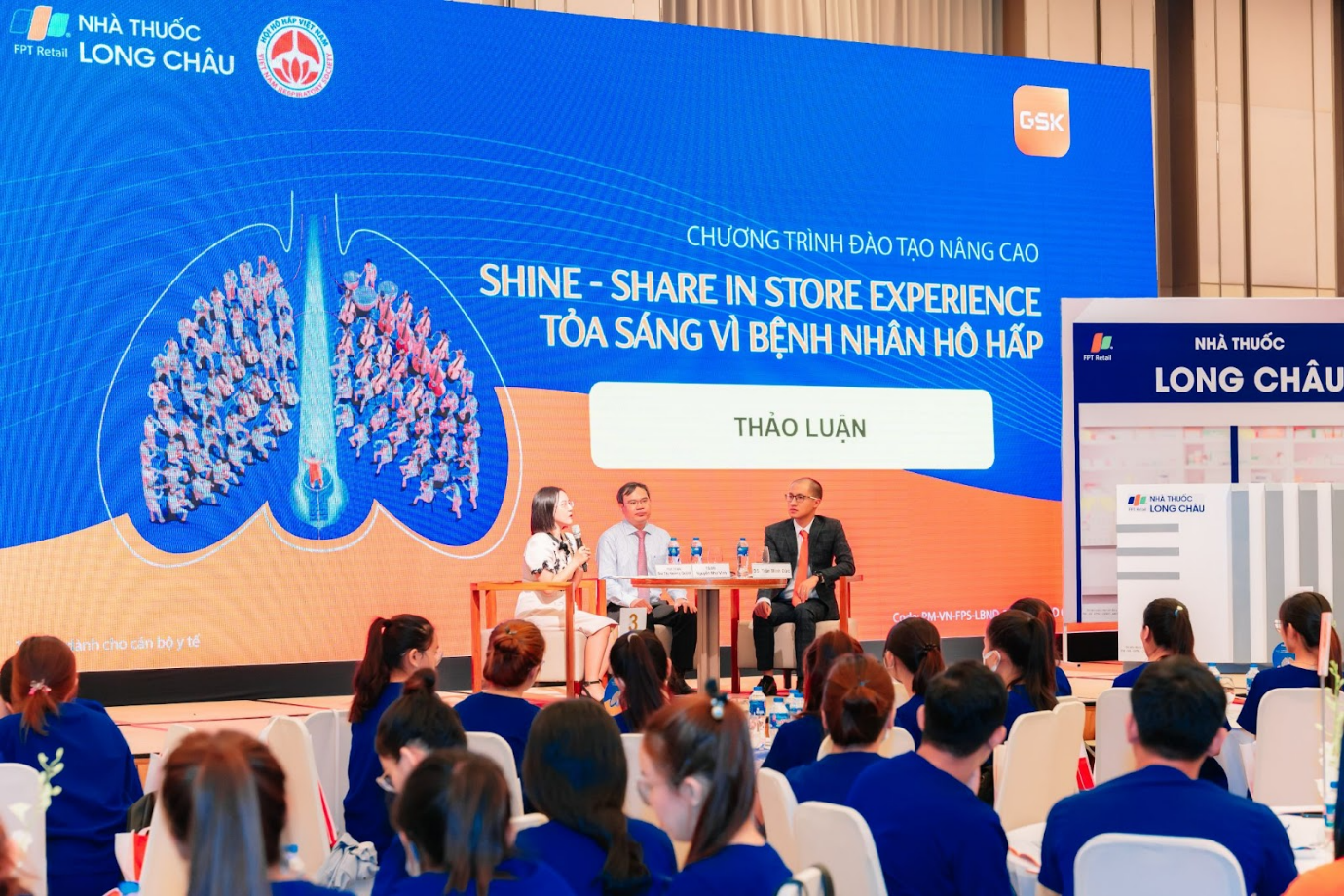 Theo đó, sáng 17/5, nhà thuốc FPT Long Châu và GSK Việt Nam đã cùng phối hợp triển khai chuỗi hoạt động đào tạo chuyên sâu thuộc chương trình "Shine: Tỏa sáng vì bệnh nhân hô hấp", với sự góp mặt của các đại diện Hội hô hấp Việt Nam cùng ban cố vấn cấp cao của hai đơn vị, hướng đến mục tiêu giúp đào tạo toàn diện về chuyên môn bệnh học lẫn kỹ năng tư vấn chuyên nghiệp nhóm bệnh hen suyễn - COPD.