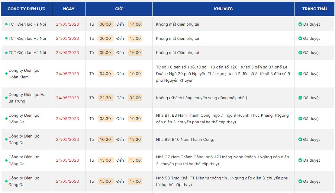 Đáng chú ý, quận Cầu Giấy trong ngày 24/5 không ghi nhận cắt điện tại khu dân cư. Chỉ có trụ sở Dàn nhạc giao hưởng Việt Nam tại số 226 Cầu Giấy bị cắt điện từ 9h đến 14h.
