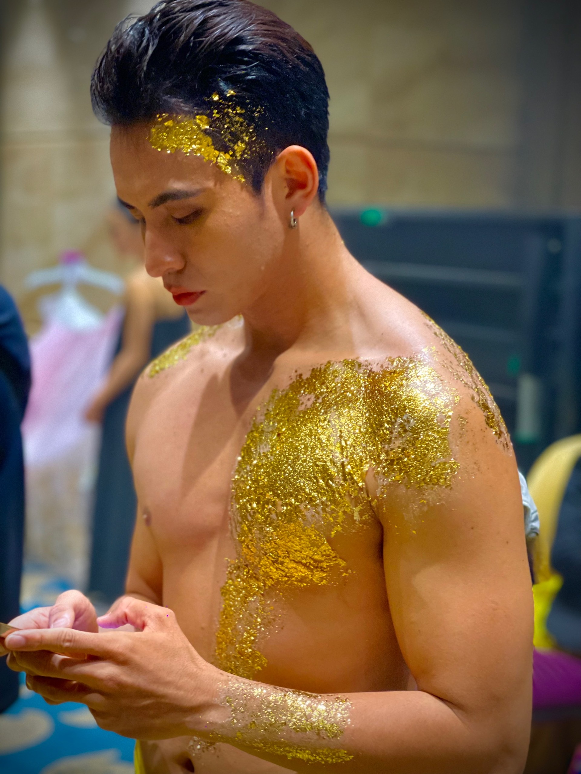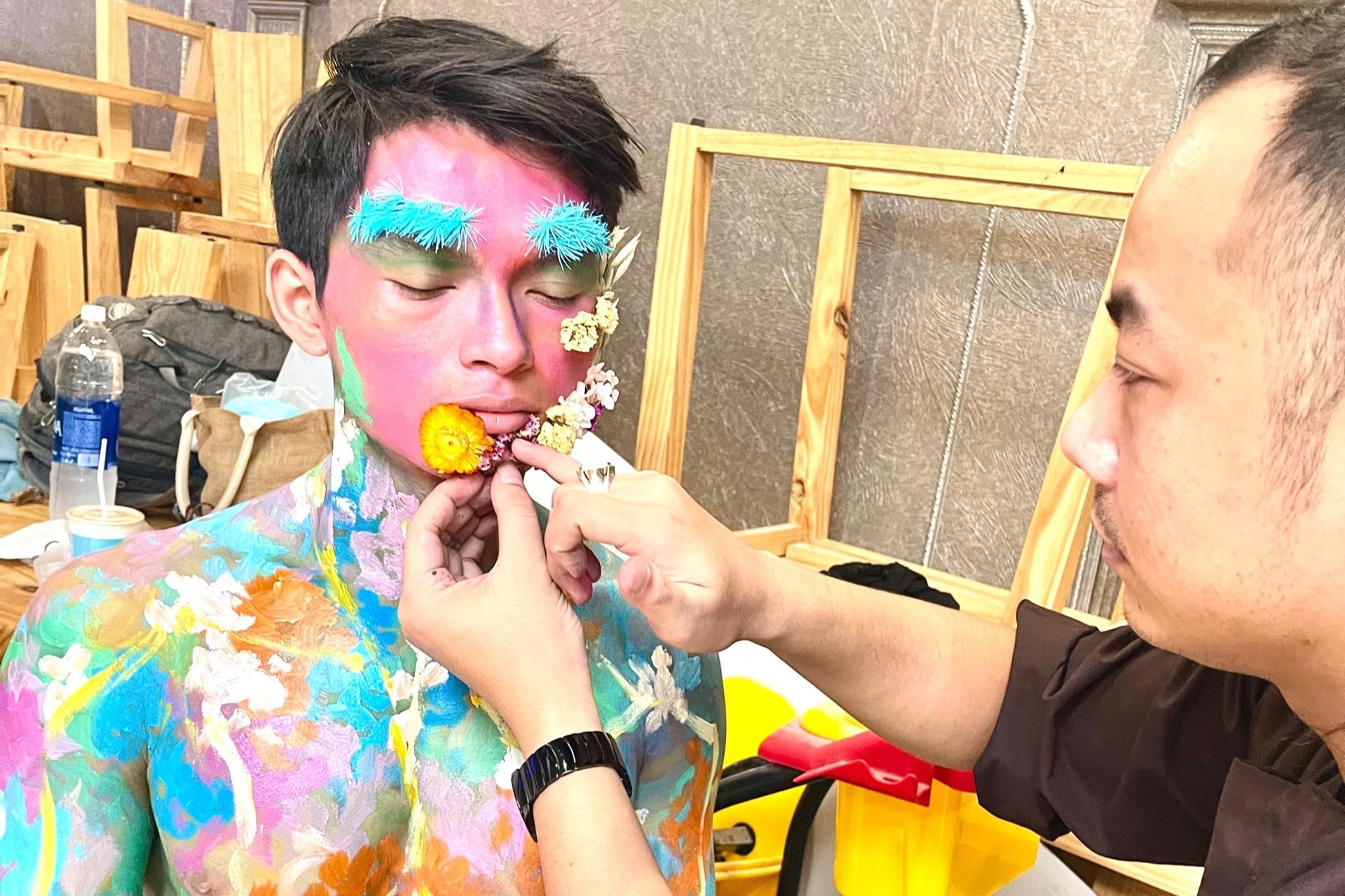 Chàng trai trẻ đã một mình bay từ TPHCM ra Đà Nẵng, chủ động trang điểm và chịu đựng sự khó chịu từ lớp hóa trang dày cộm suốt một ngày diễn. Mỗi lần "hóa tượng", Hải phải tập thở bằng bụng để lồng ngực không nhấp nhô, bất động lên đến 10 phút để khán giả tin cậu là một bức tượng thực thụ.