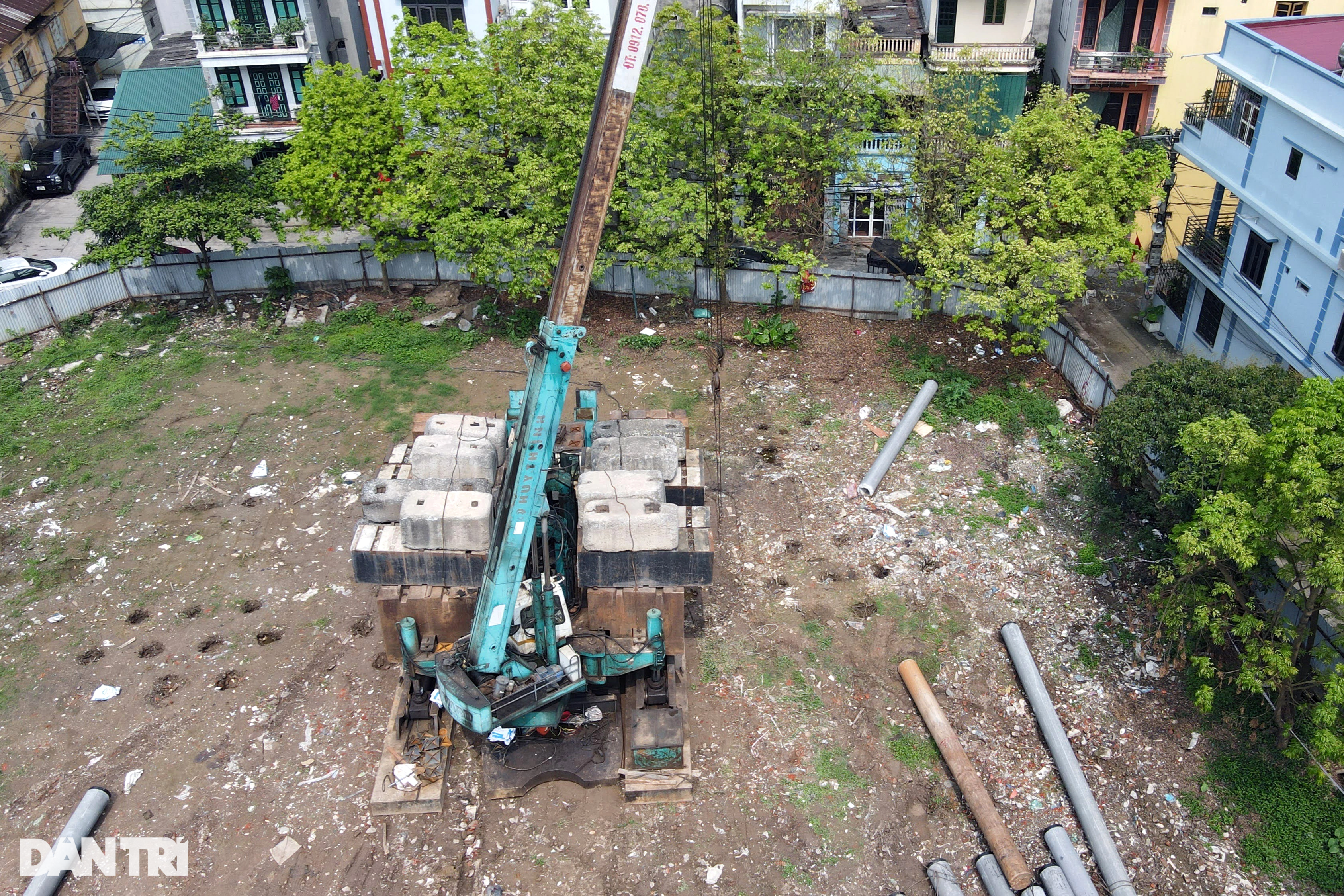 Bên trong dự án này có máy ép cọc nhưng chưa có hoạt động xây dựng nào khác.
