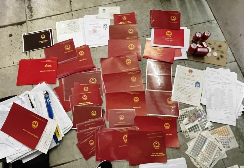 Khám xét khẩn cấp nơi làm việc và nơi ở của Thành và các đồng phạm, cơ quan công an thu giữ 2 máy tính xách tay, 7 điện thoại di động, 2 máy in màu, 18 con dấu cùng nhiều giấy tờ, văn bằng, tài liệu giả của cơ quan Nhà nước.