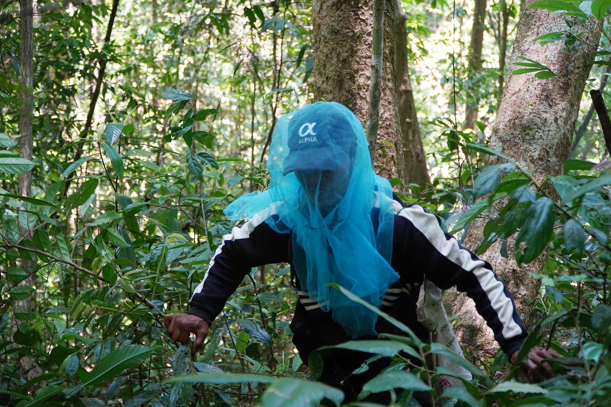 Khi băng rừng, lội suối hay lúc dừng chân nghỉ ngơi, cả nhóm do Đinh Văn Thiêng (36 tuổi) dẫn đường luôn dõi mắt tìm tổ ong trên ngọn cây cao, trong bụi rậm. Cũng có lúc phát hiện đàn ong, cả nhóm chia nhau lần tìm theo đến tổ.