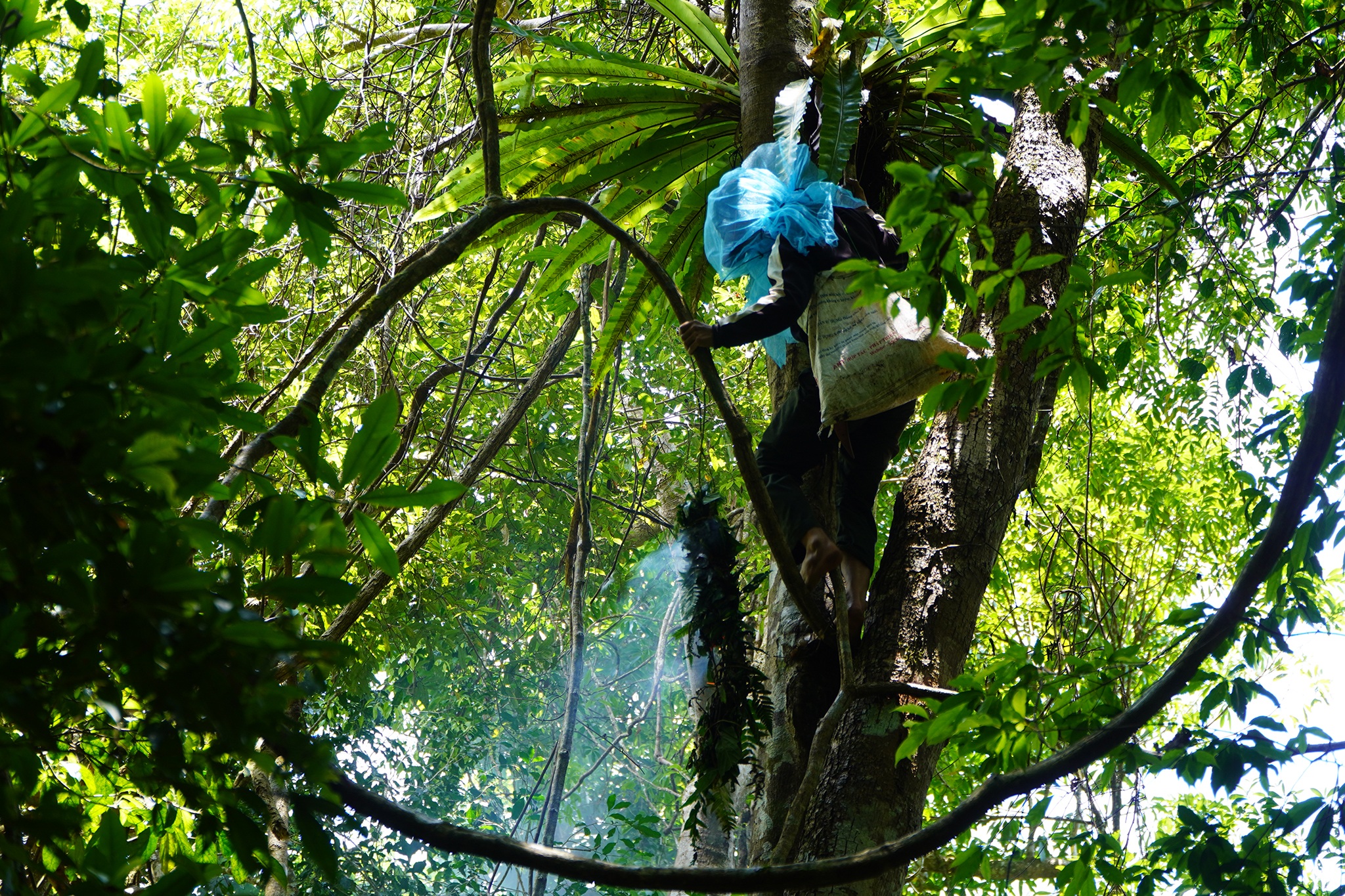Anh Thiêng sau đó cột bó đuốc vào người, mang túi, dao và trùm mảnh lưới vào đầu rồi nhanh nhẹn leo lên ngọn cây để tìm cách lấy mật.