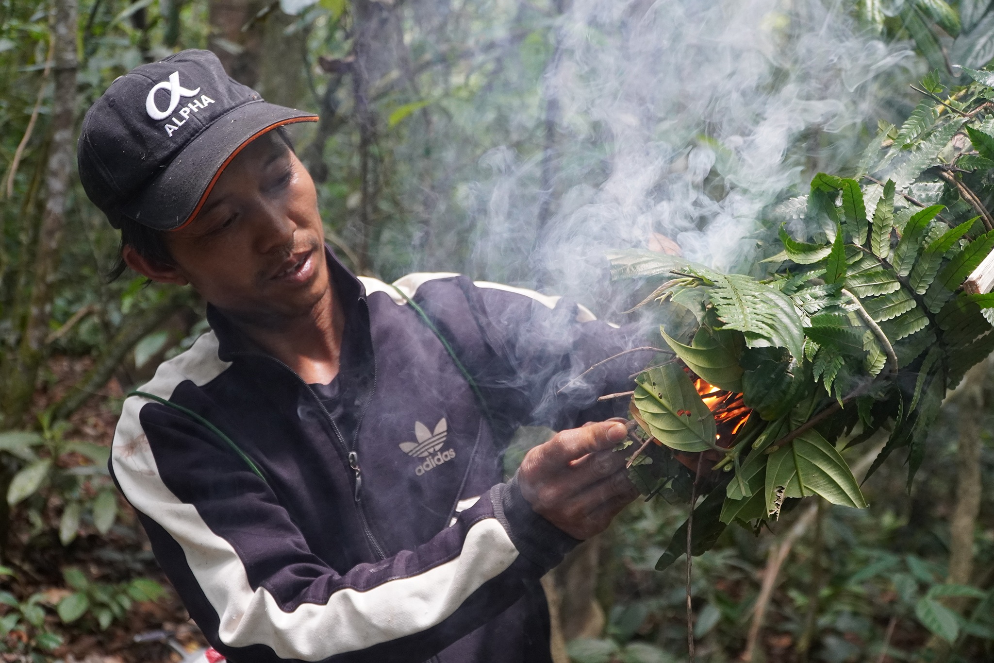 Theo dấu một đàn ong, chúng tôi phát hiện tổ ong trên cây cao 20m. Ngay lập tức, anh Thiêng liền chuẩn bị củi khô, lá xanh quấn bên ngoài tạo thành bó đuốc để hun khói cho ong bay khỏi tổ.
