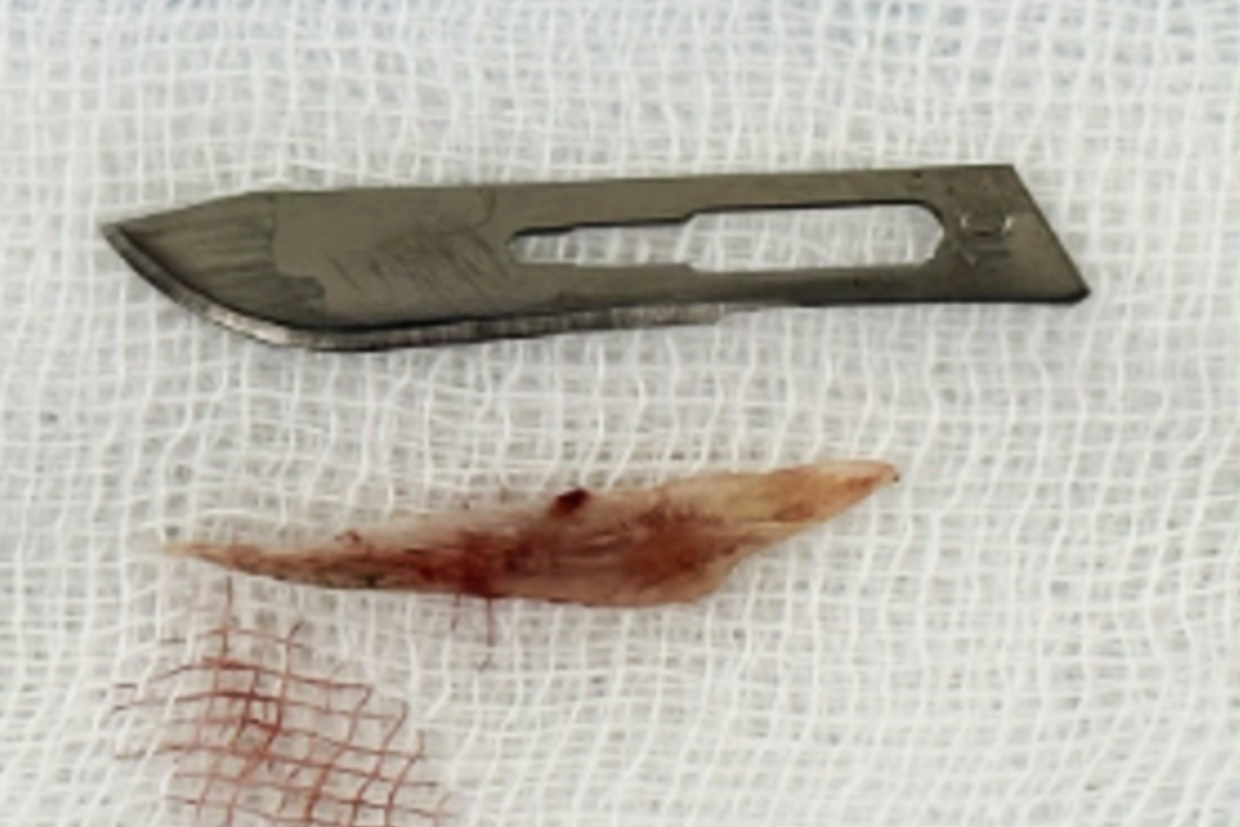 Sau gần 30 phút tìm kiếm, ekip phẫu thuật đã xác định được dị vật và xử lý. Chiếc xương cá lấy ra có chiều dài khoảng 3cm, chiều rộng chỗ lớn nhất khoảng 0,6cm.