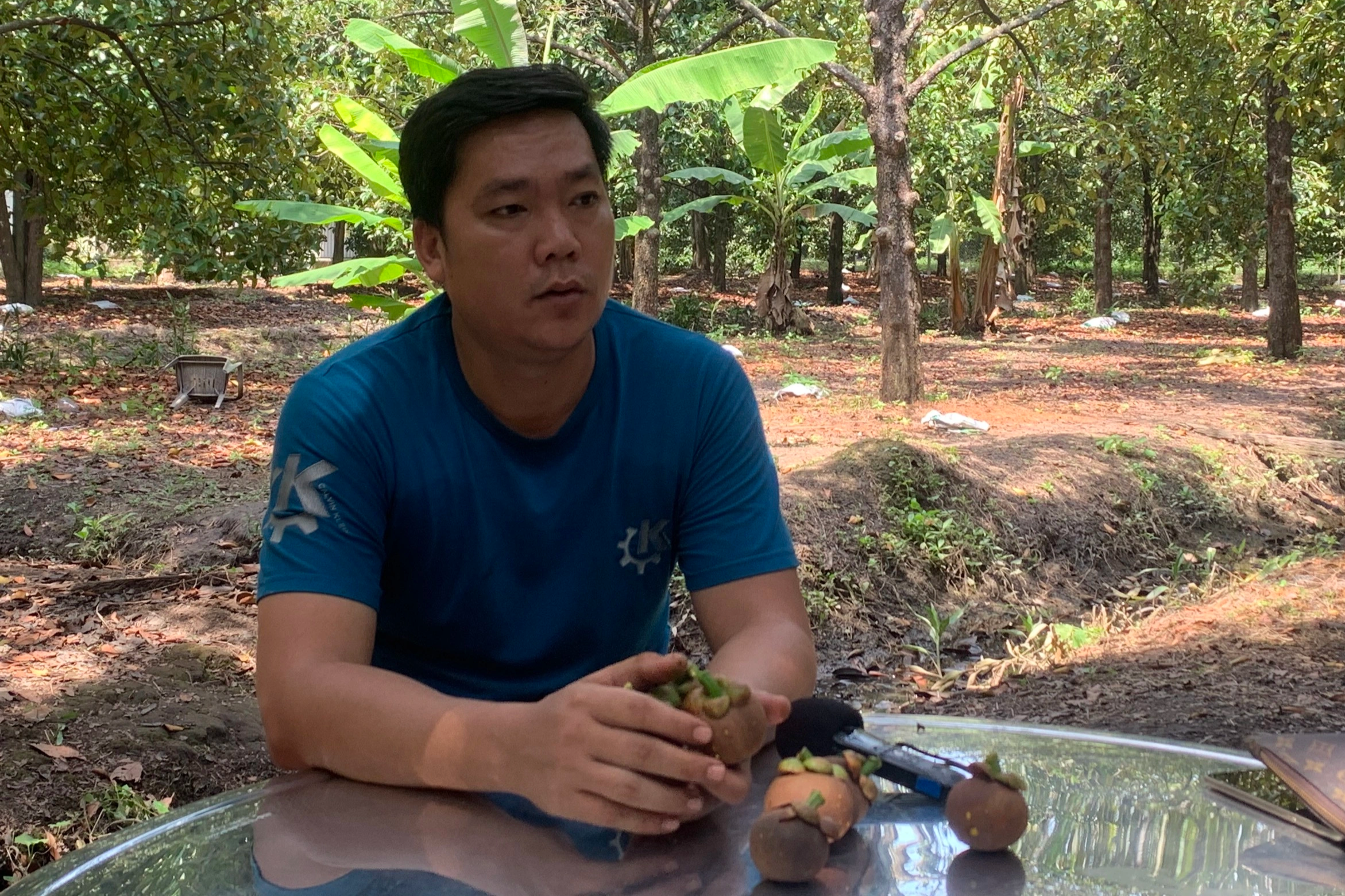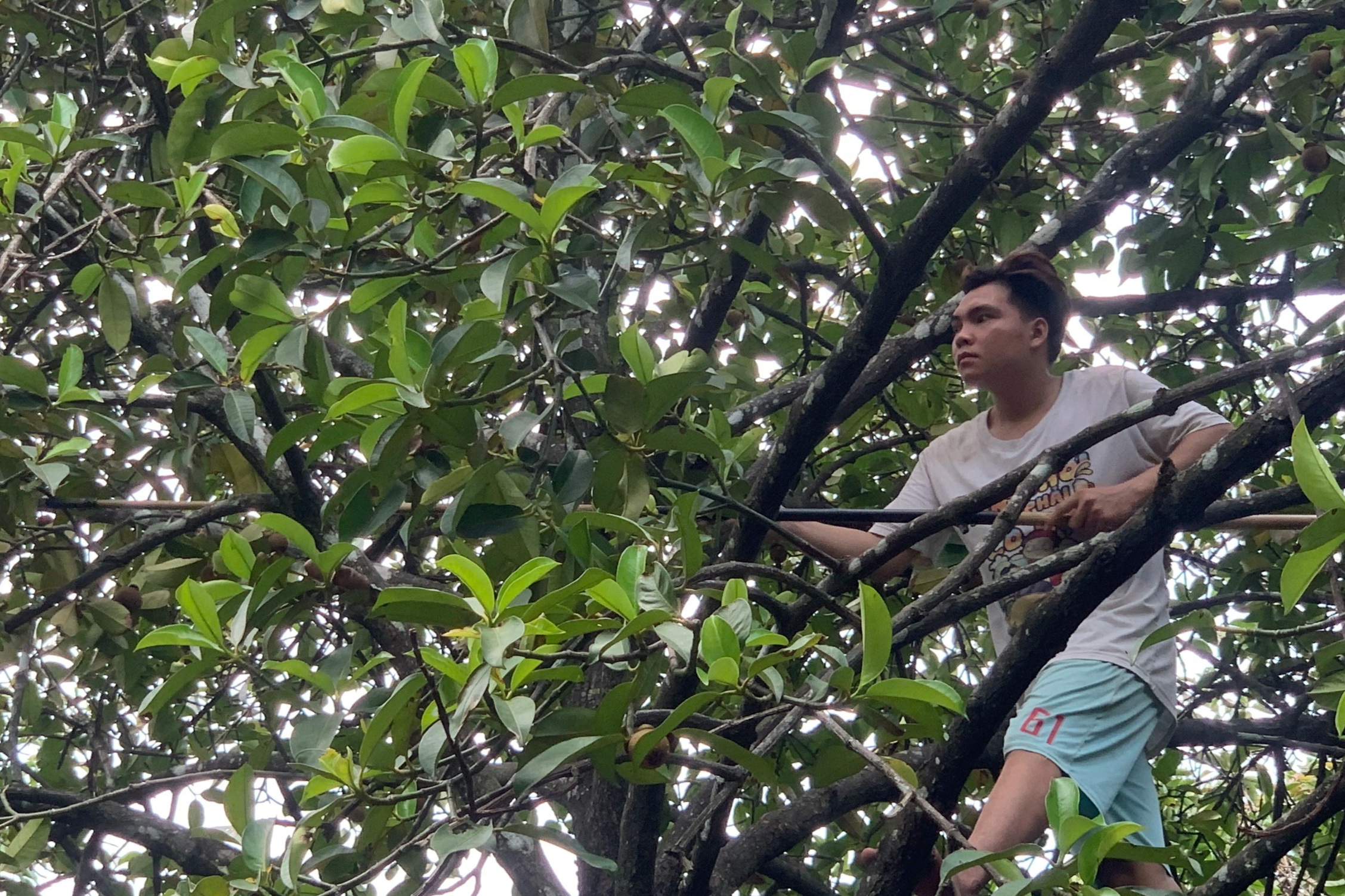 Anh Nguyễn Thành Nam làm nghề thợ sơn nước, hiện đang thất nghiệp, tranh thủ tìm đến vườn măng cụt nhà anh Trợ xin làm thuê. Một ngày làm việc của anh bắt đầu làm từ 7h30 đến khoảng 17h.