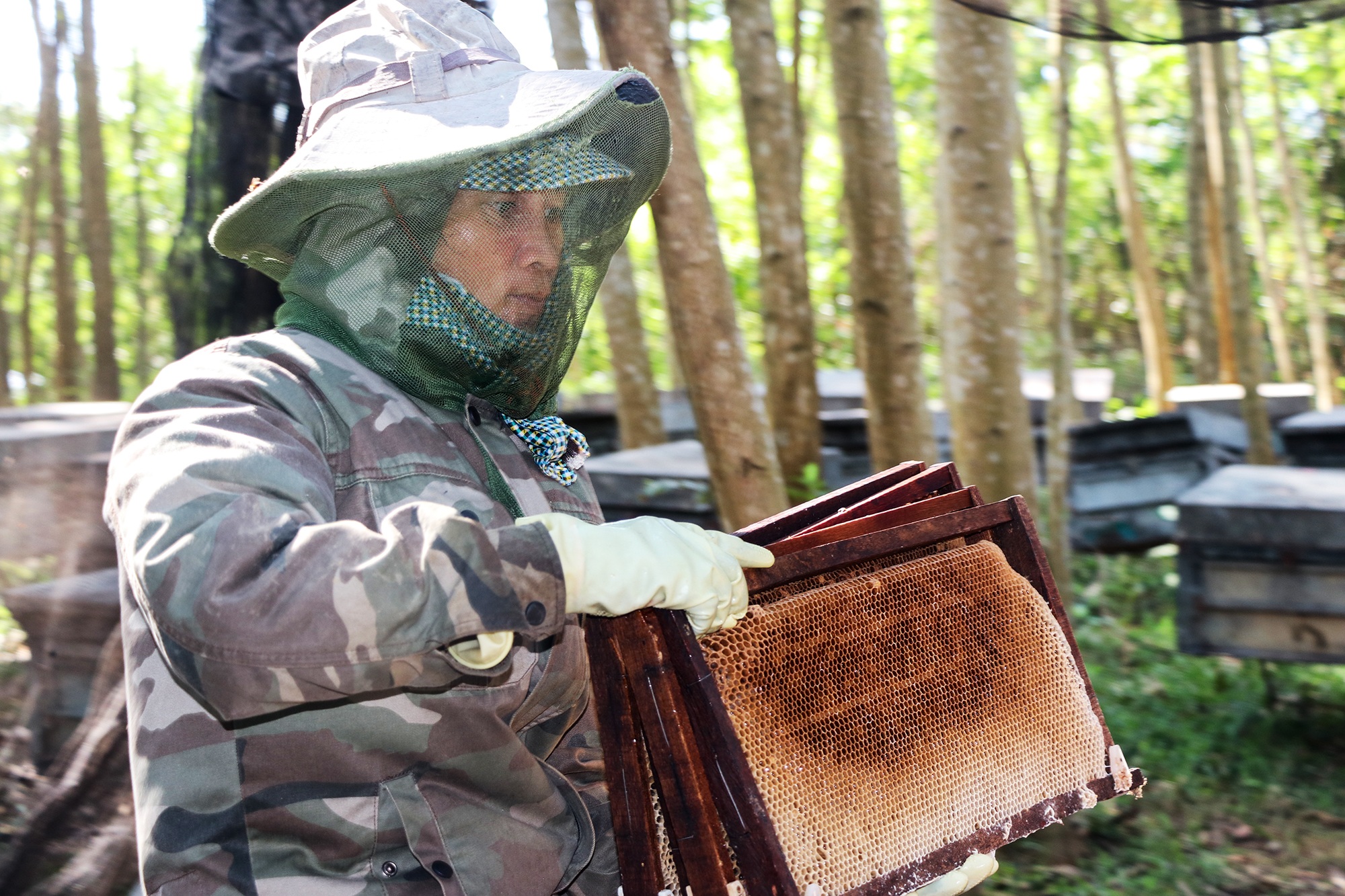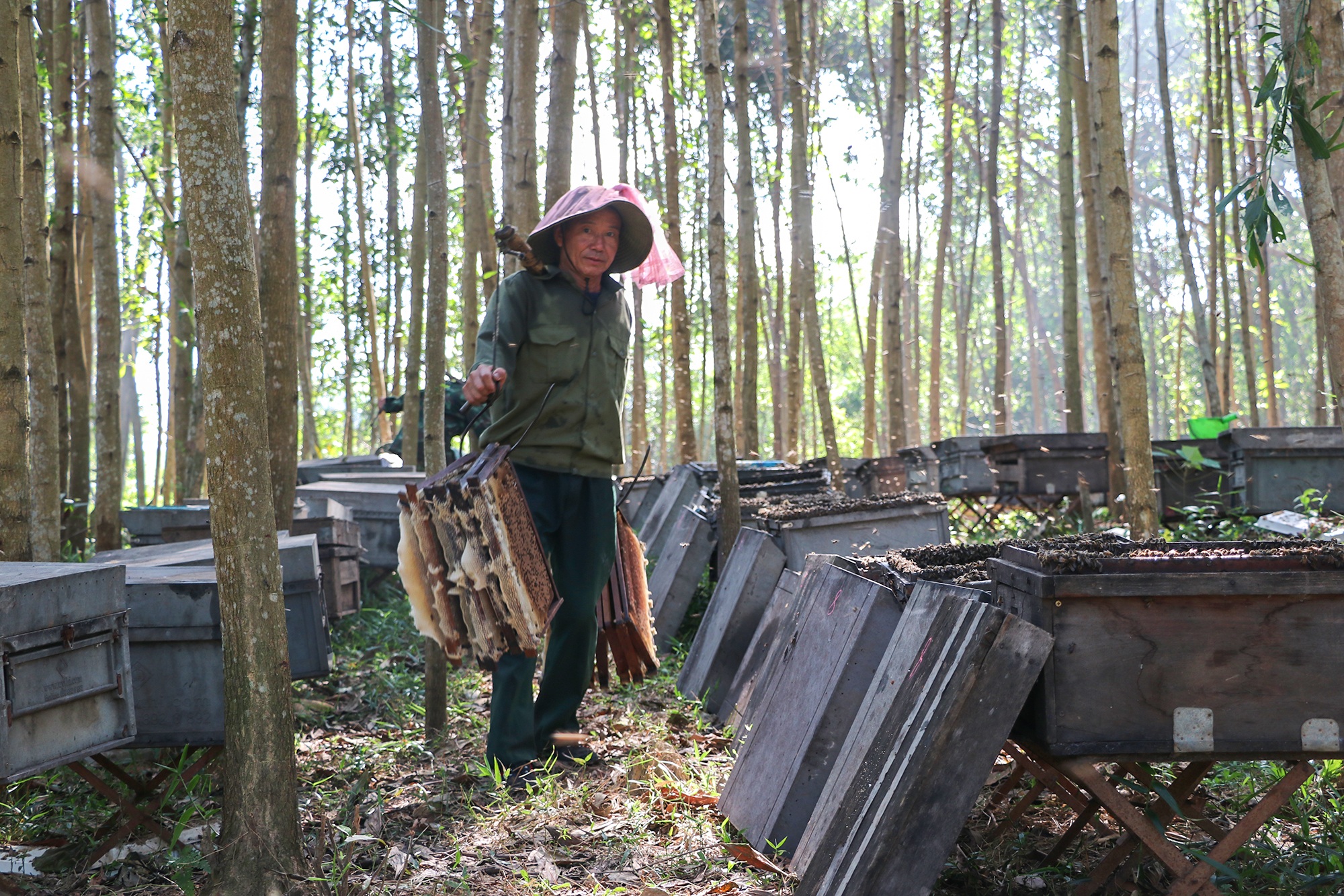 "Mật cao su mong nắng, mật keo thì mong mưa bởi trời mưa sản lượng mật sẽ cao hơn, chất lượng mật cũng tốt hơn. Trời mưa nhiều thì trung bình một tuần sẽ thu hoạch mật một lần còn trời nắng nóng thì 10-15 ngày, thậm chí lâu hơn mới thu hoạch được mà sản lượng cũng thấp hơn", anh Trần Văn Tuyền, một chủ trại ong cho hay.