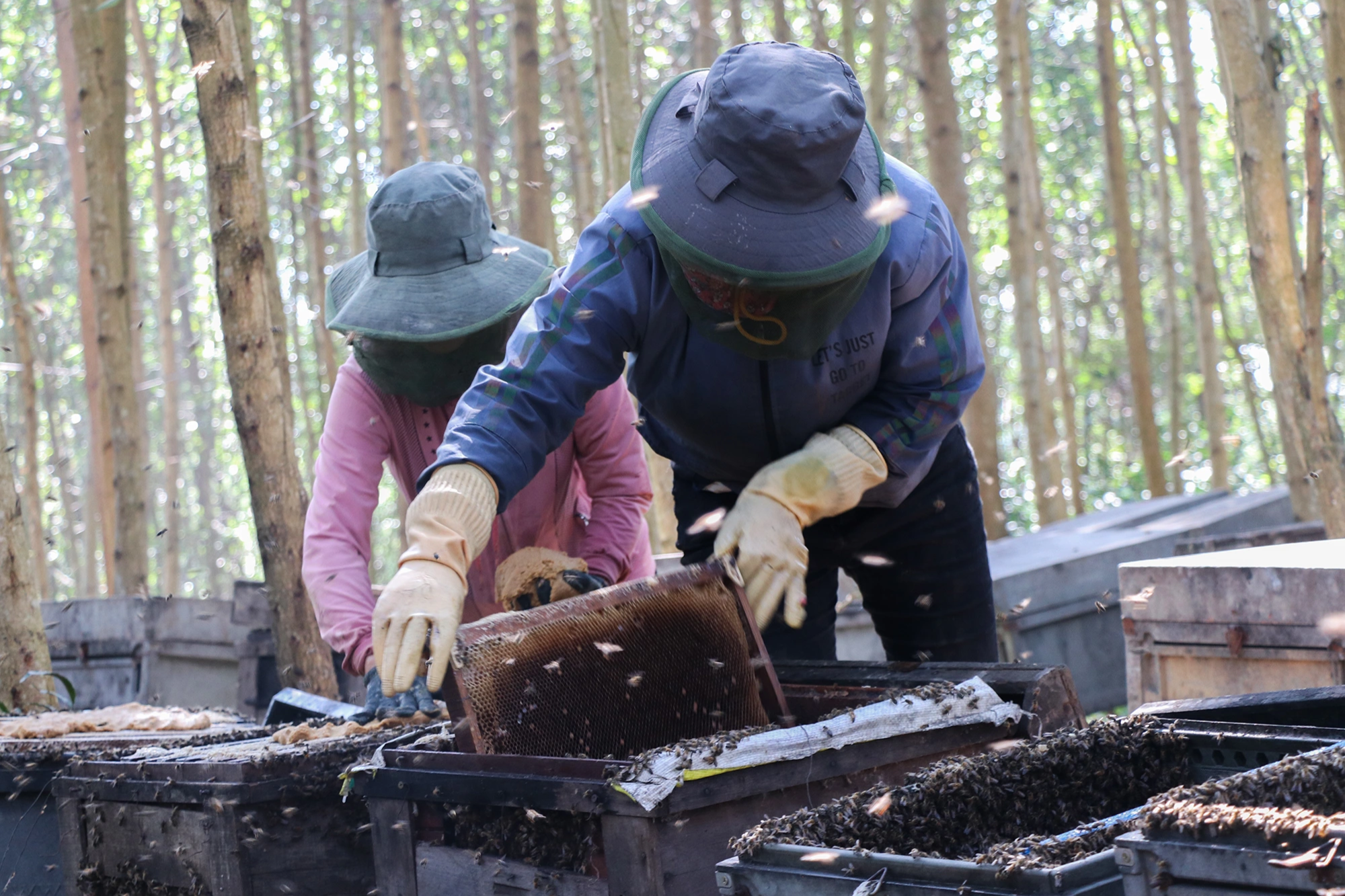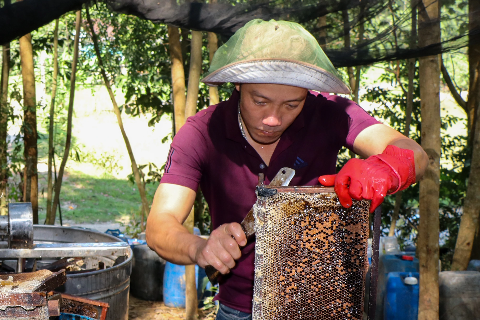 Tại trại nuôi ong của anh Tuyền, vào ngày quay mật có hơn 10 lao động địa phương làm việc để vận chuyển cầu ong, quay thùng, đóng mật vào can... Mức tiền công chủ trại trả cho các lao động thời vụ ngang nhau, không phân biệt vị trí việc làm.