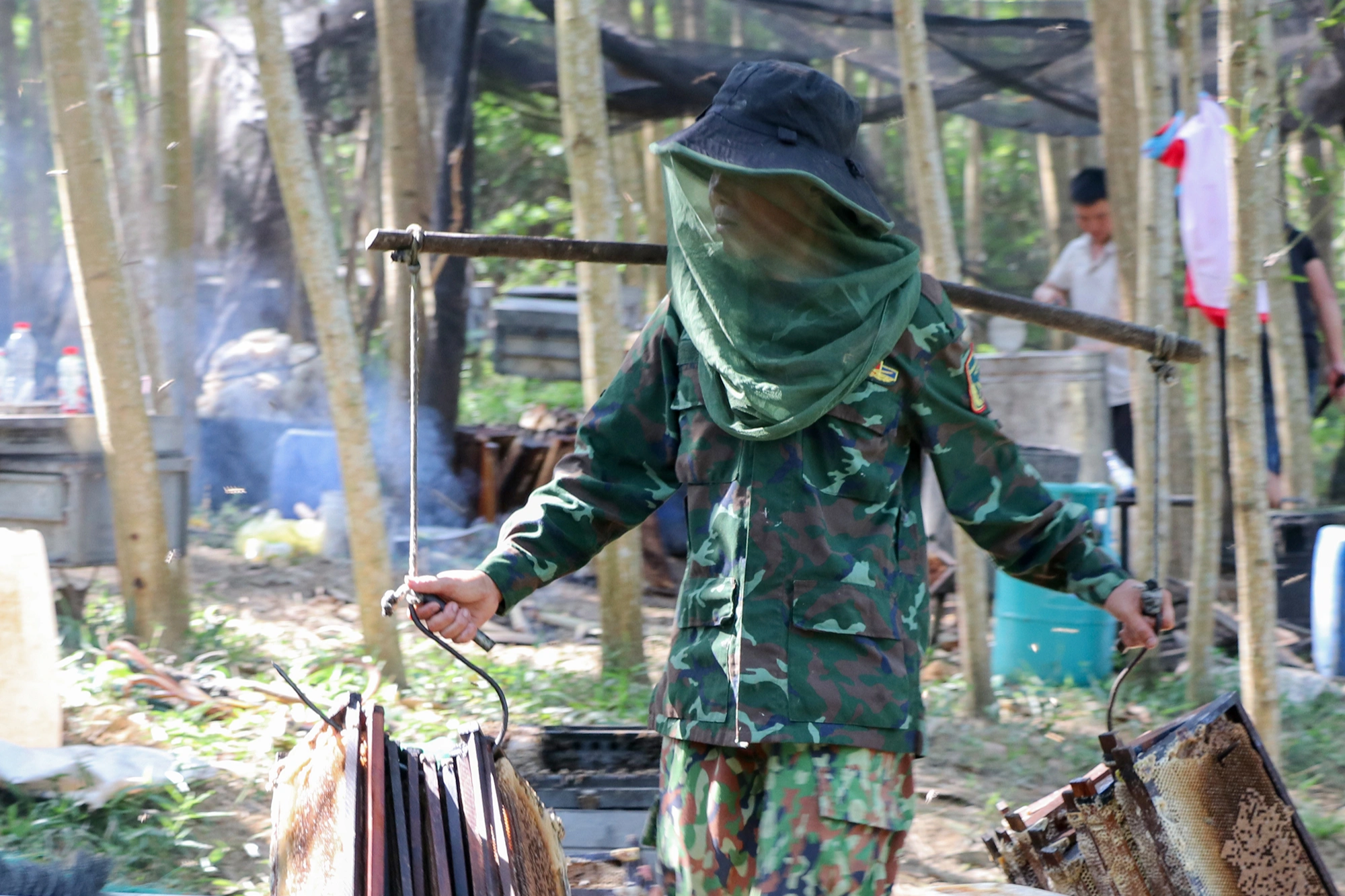 Với 600 thùng ong, thợ phải bắt đầu làm việc từ 6h để kịp hoàn thành công đoạn quay mật trước 10h để giảm ảnh hưởng của nắng nóng.
