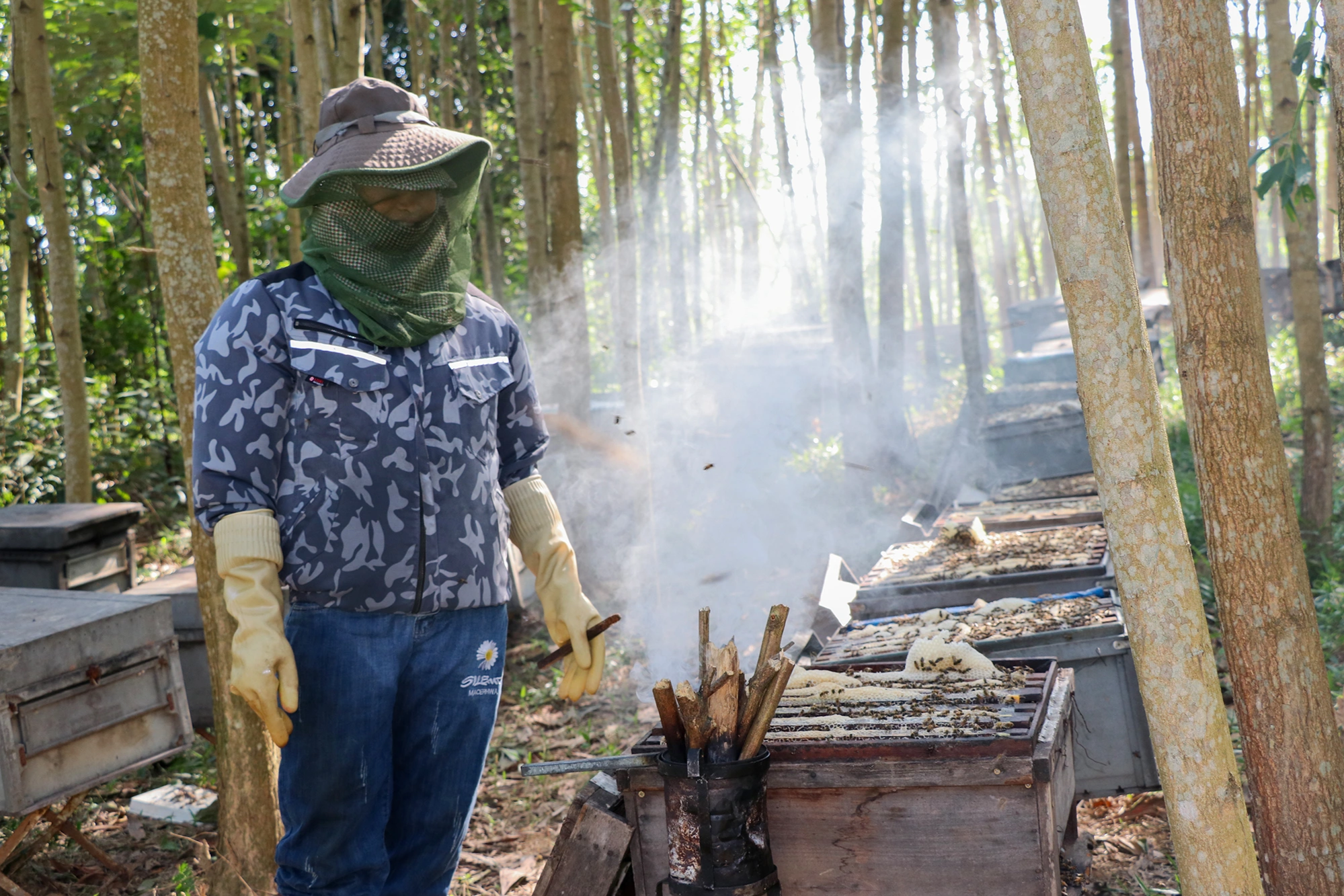 Ngoài dùng khói để xua đuổi ong, trang bị mũ, lưới che mặt, găng tay và ủng cao su "như Ninja", trước khi lấy các "cầu mật", thợ phải phun nước vào để giảm sự hung dữ của đàn ong khi bị kích thích.