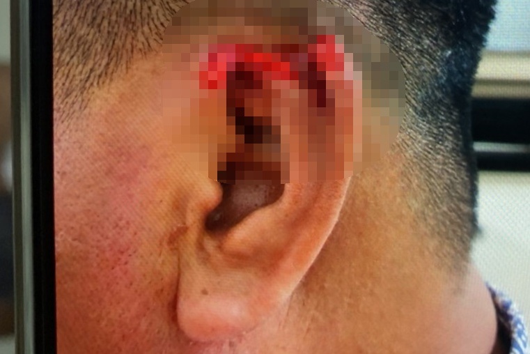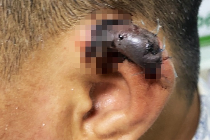 Bệnh nhân là một người đàn ông 41 tuổi, quê Phú Yên, được chuyển vào Bệnh viện Tai Mũi Họng TPHCM tối 7/6 trong tình trạng có vết thương đứt lìa ở vành tai trái, được khâu nối lại nhưng vùng bị đứt đã tím đen, có dấu hiệu hoại tử.