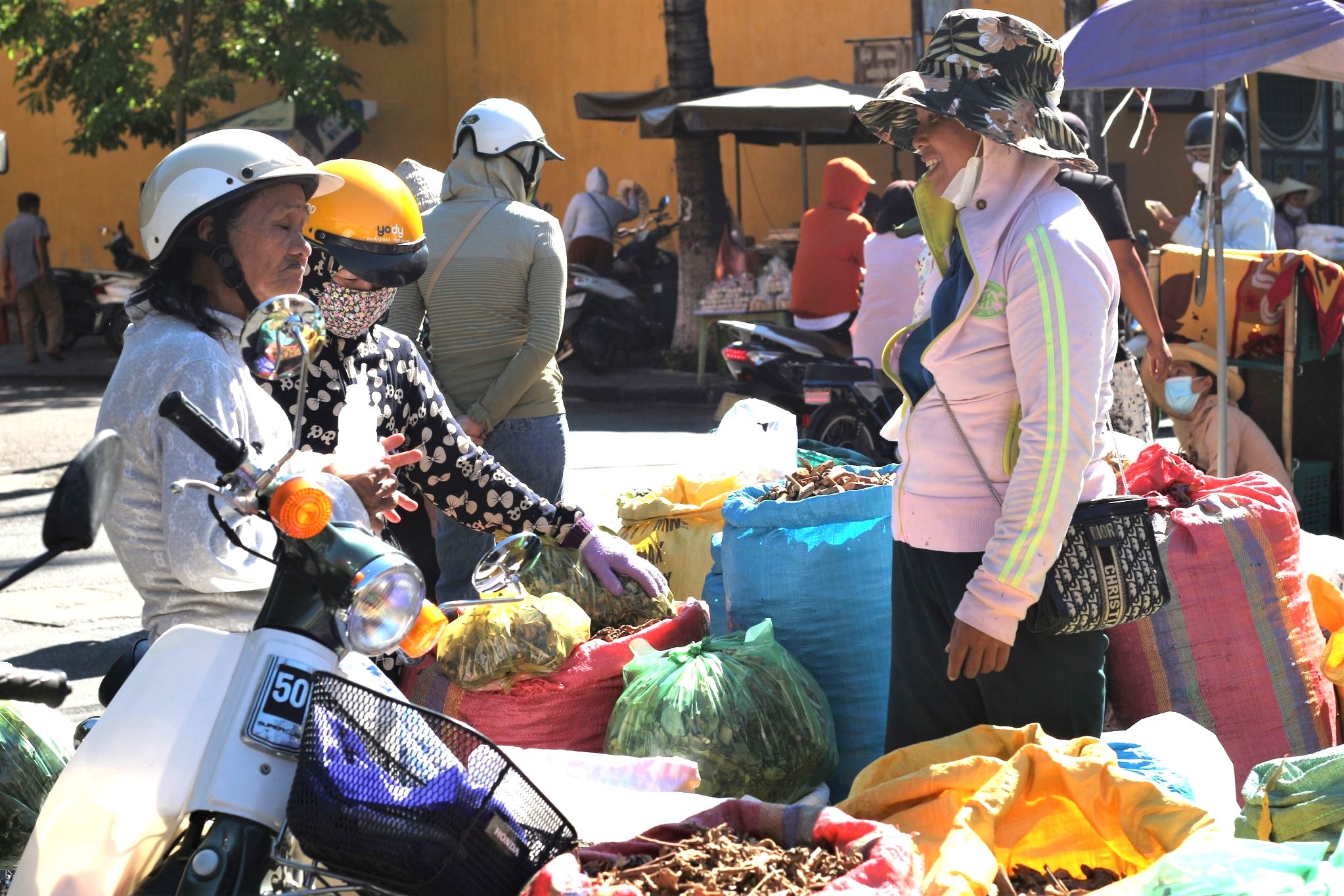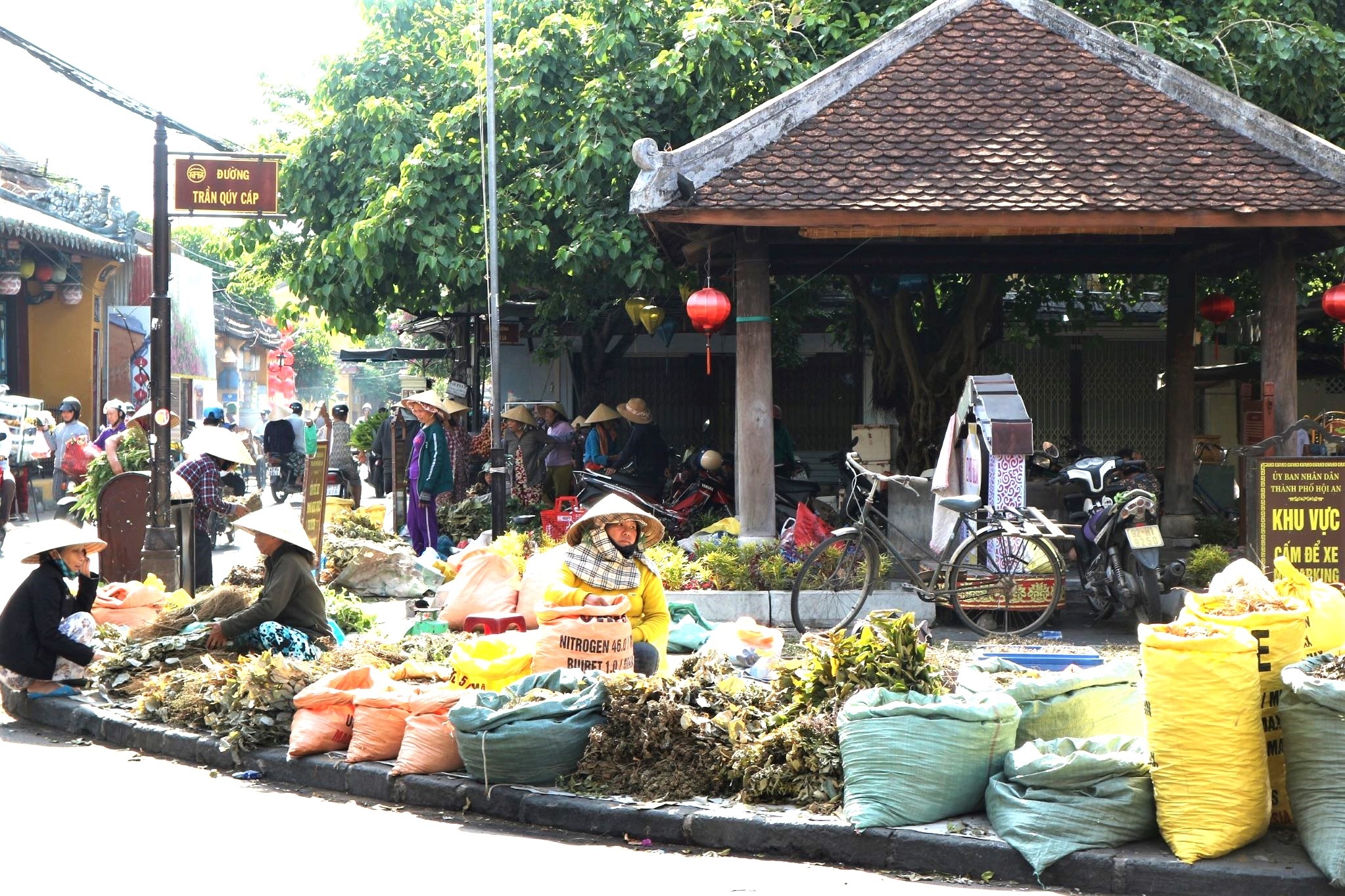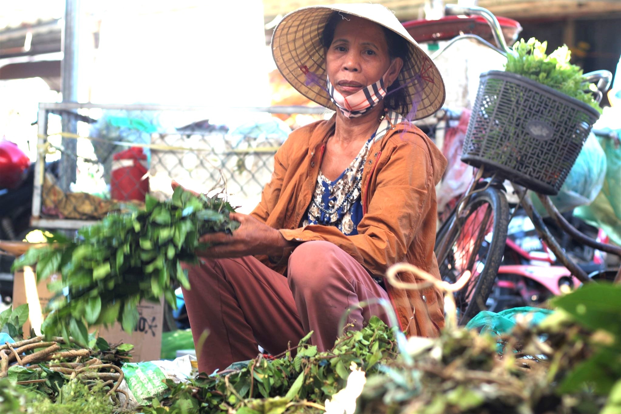 Tết Đoan Ngọ (mùng 5/5 âm lịch) tại chợ Hội An, từ sáng sớm, cụ Nguyễn Thị Miên (70 tuổi, huyện Hiệp Đức, Quảng Nam) tranh thủ bày bán các loại lá đã cất công sưu tầm hơn một tháng qua để khách lựa chọn.