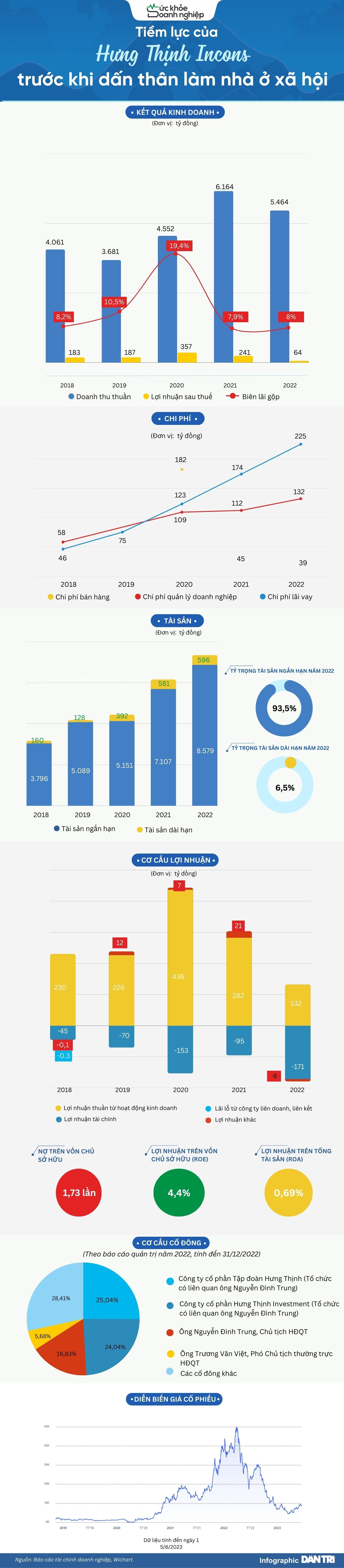 Năm 2022, Hưng Thịnh Incons tăng thêm 29% nợ vay tài chính (đều là nợ vay ngắn hạn), ở mức 2.537 tỷ đồng, khiến chi phí lãi vay tăng tương ứng. Nợ vay tài chính trên vốn chủ sở hữu là 1,73 lần.