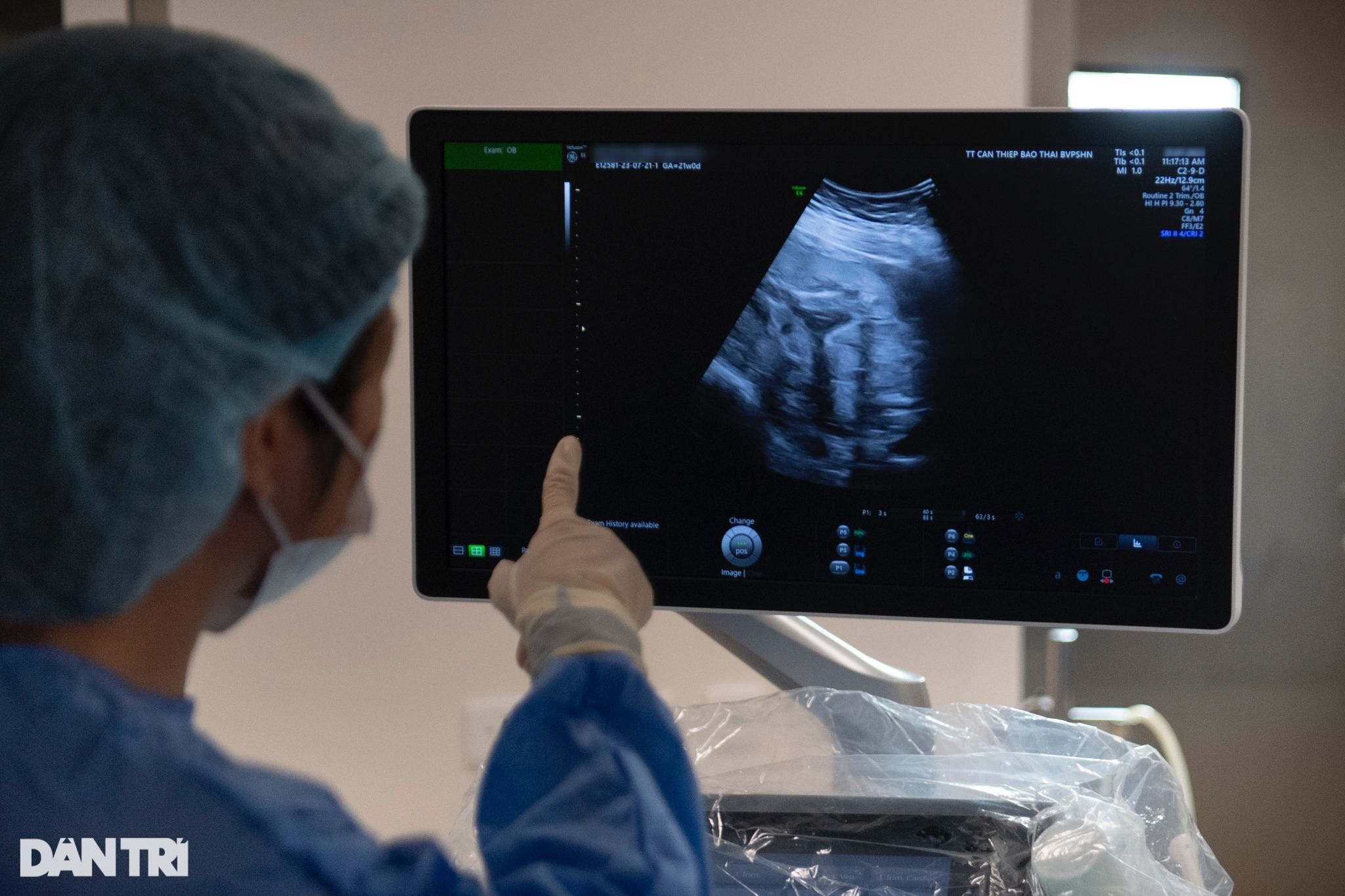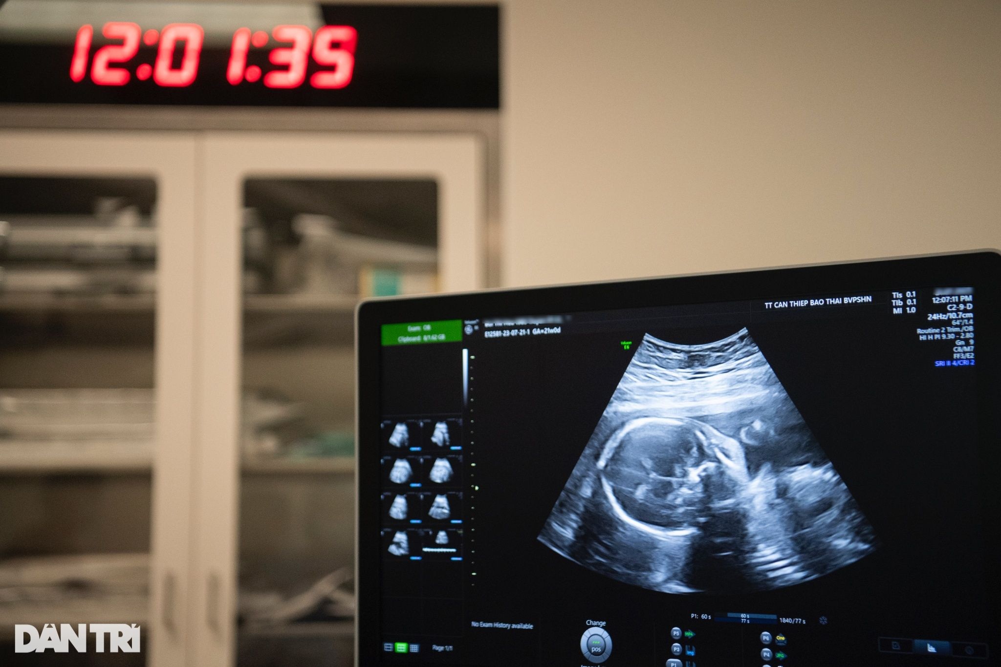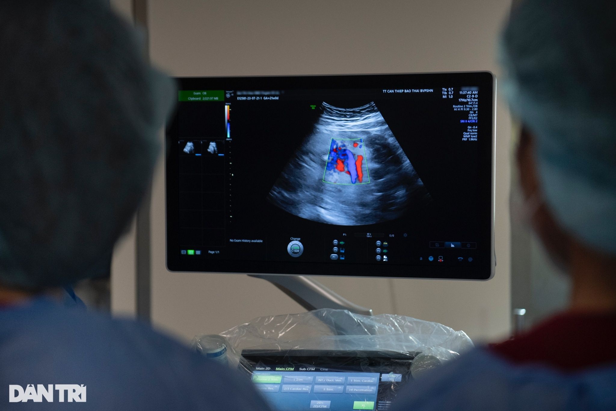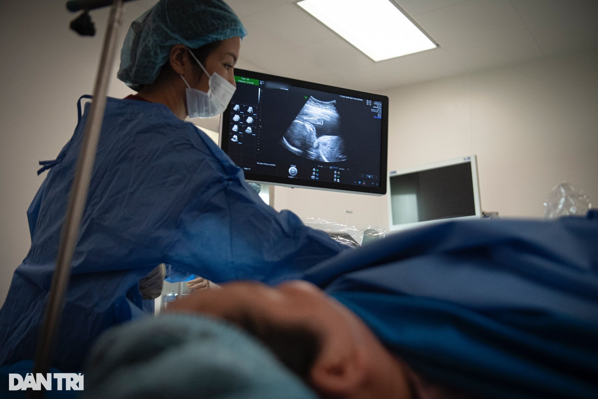 11h15, BS Sim đặt đầu dò của máy siêu âm lên vùng bụng đã được thoa thuốc sát trùng trước đó của sản phụ. "Chị yên tâm, cố gắng giữ bình tĩnh, mọi chuyện sẽ ổn thôi", phía đầu giường, nữ điều dưỡng khẽ động viên.