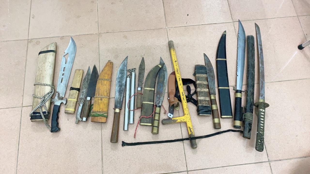 Khám xét nhà đối tượng, lực lượng chức năng thu giữ khoảng hơn 100gram chất bột trắng (nghi ma túy), cùng 10 dao, kiếm, côn nhị khúc.