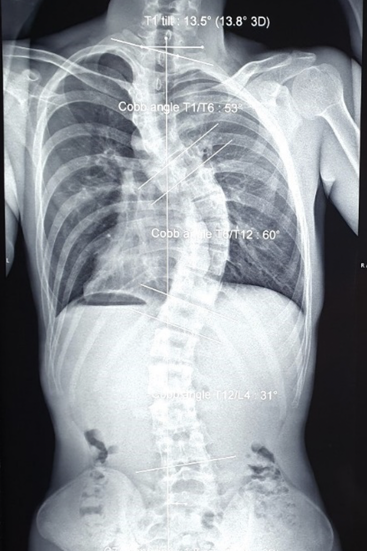 Vai trái Đ. lệch cao gần 5cm so với vai phải, lồng ngực biến dạng và lệch vẹo khung chậu. Ảnh chụp X-quang ghi nhận bệnh nhân bị vẹo cột sống đoạn ngực chữ S rất nặng.