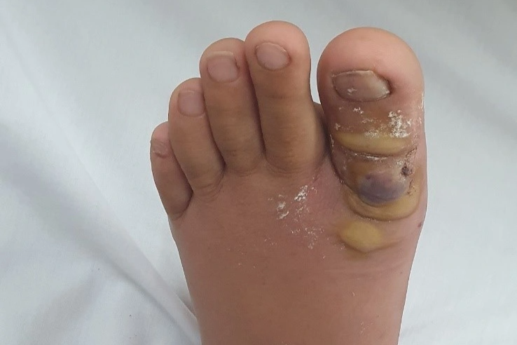 Tại thời điểm nhập viện, chân bệnh nhân bị tấy đỏ, đầu ngón chân cái mưng mủ. Không chỉ vậy, từ cổ chân đến bàn chân cô gái đều sưng nề.